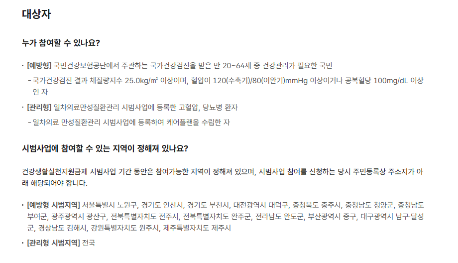 주요 대상은 건강 위험 요인을 가지고 있는 사람들에게 우선적으로 제공되며, 특히 고혈압, 당뇨병 등 만성질환의 전 단계에 있는 사람들에게 예방적 관리를 위한 동기를 부여하는 데 큰 역할을 합니다. 혈압이나 혈당 수치가 높지만 아직 약물 치료 단계는 아닌 사람들이 생활 습관 개선을 통해 질병 발병을 늦추거나 예방할 수 있도록 지원합니다. 또한, 흡연이나 과체중 등 건강에 해로운 습관을 가진 사람들도 참여하여 건강한 생활 습관을 형성할 수 있도록 돕습니다.