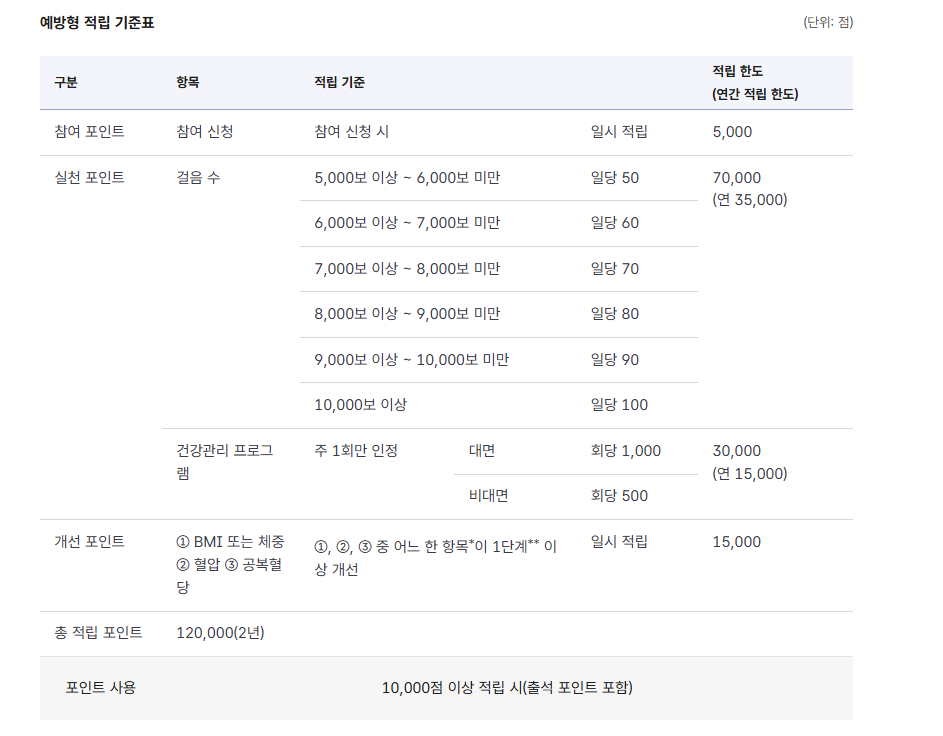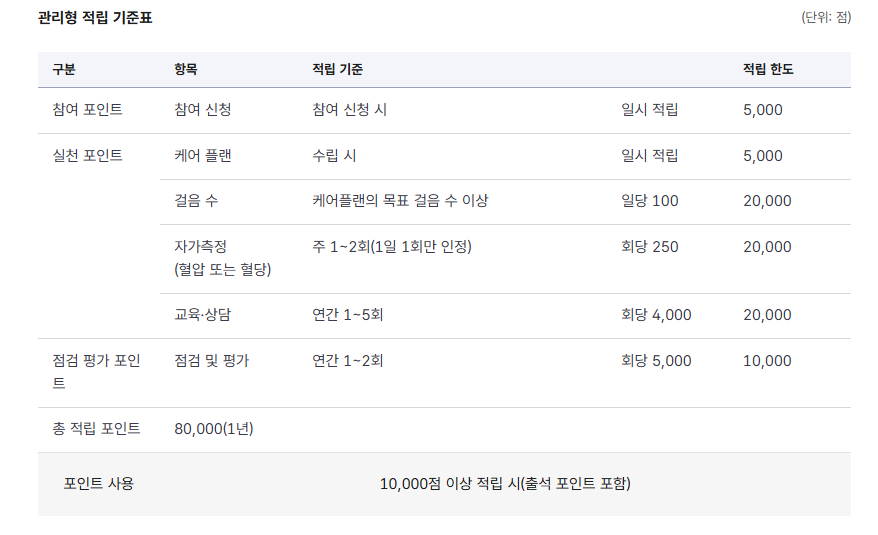 프로그램별 상이 : 참여하는 건강생활 실천지원 프로그램의 유형(예: 고혈압·당뇨병 관리형, 건강 위험군 관리형 등)에 따라 포인트 획득 기준과 방식이 다를 수 있으므로, 본인이 신청한 프로그램의 세부 지침을 반드시 확인해야 합니다.