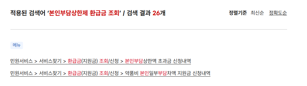 메인 페이지 검색창 활용: 본인부담 상한제 또는 환급금 등의 키워드를 입력하여 검색합니다.