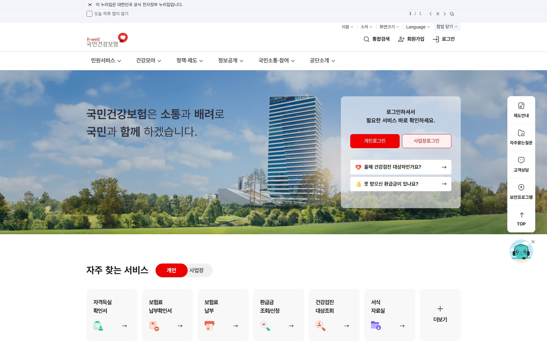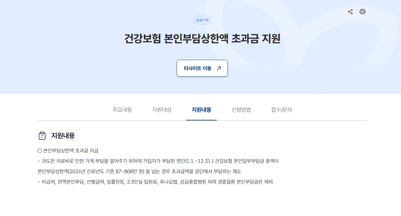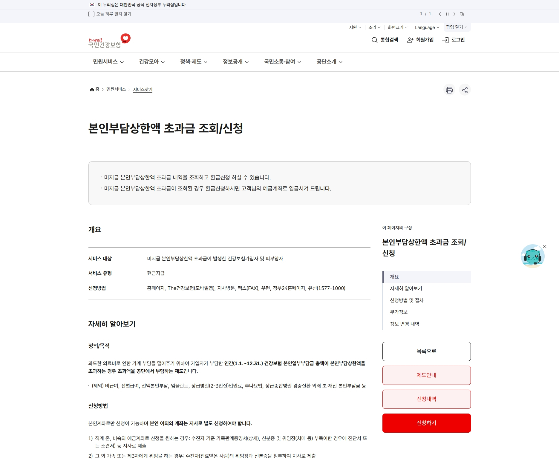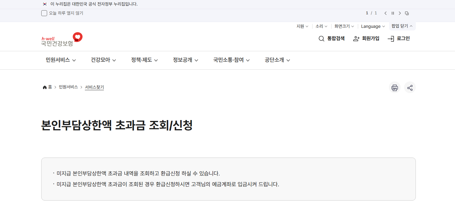 통합 민원 서비스 : 정부 24에서도 일부 건보 관련 민원 서비스를 제공하지만, 본인부담 상한제에 대한 상세 정보는 건보공단 홈페이지가 더욱 전문적입니다. 하지만 일반적인 건보 관련 정보를 얻는 데는 유용할 수 있습니다.