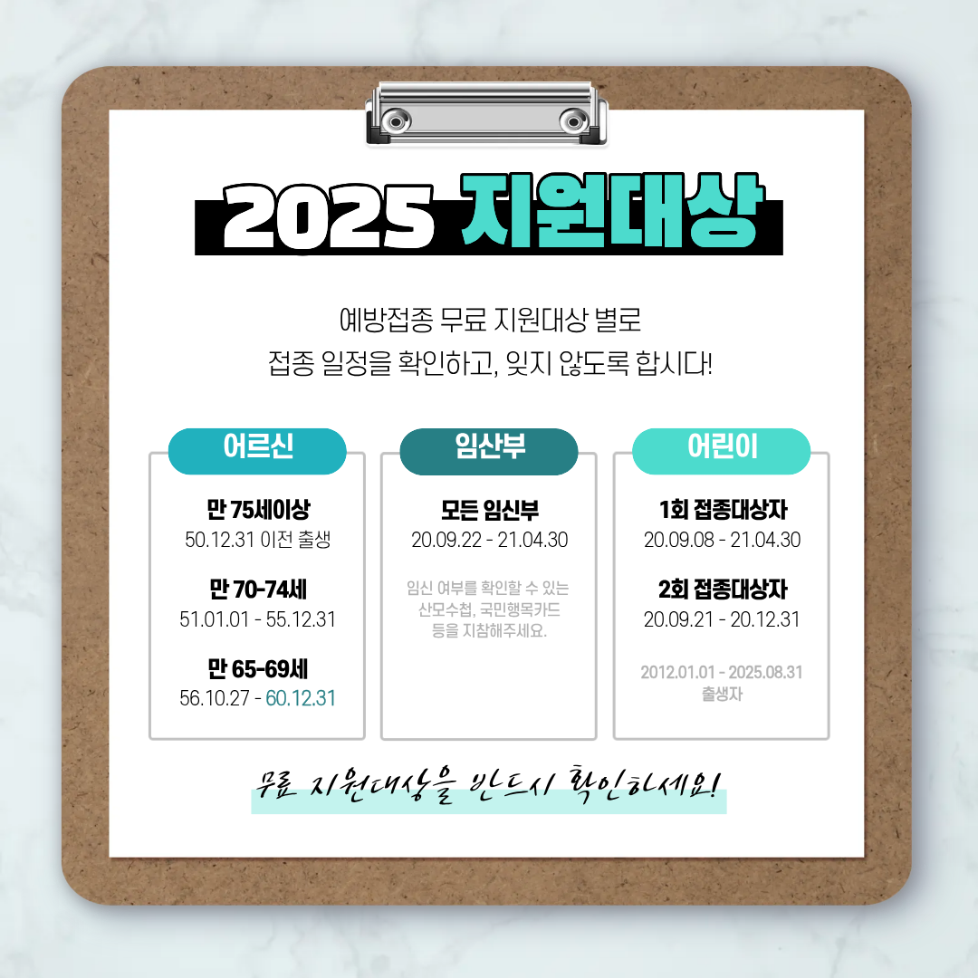 질병관리청은 2025년 9월 22일부터 2026년 4월 30일까지 2025-2026절기 인플루엔자 국가예방접종을 시행합니다.