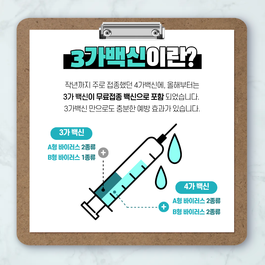 3가 백신은 A형 2종(H1N1, H3N2)과 B형 1종(빅토리아 계통)을 예방합니다.