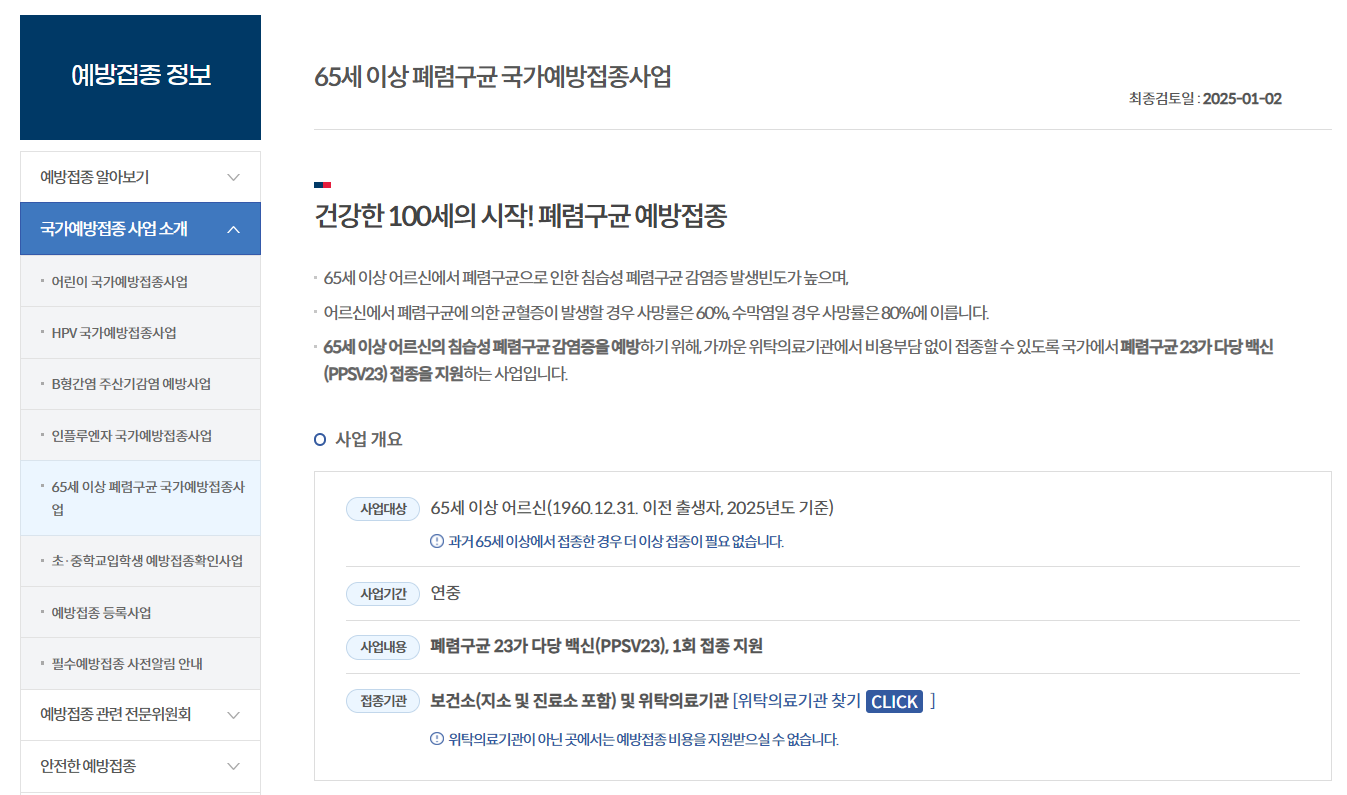 65세 이상이라면: 지체 없이 질병관리청 지정 의료기관을 검색하여 23가 백신 무료 접종 (평생 1회) 기회를 즉시 활용하세요. (비용 0원)