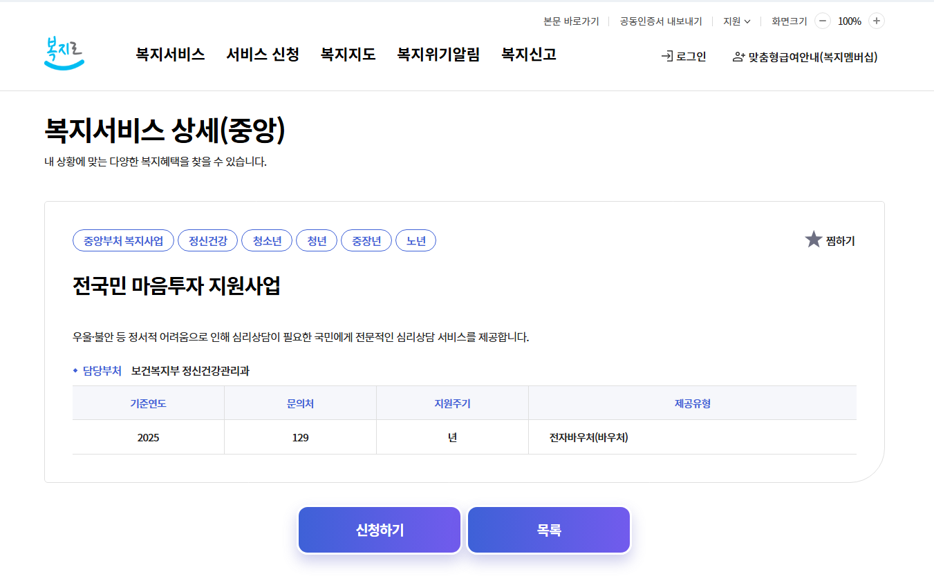 마음투자 지원사업은 정부가 국민 정신건강 회복과 정서적 안전망 강화를 위해 추진하는 복합 심리지원 프로그램이다. 보건복지부, 여성가족부, 교육부, 고용노동부 등 다양한 부처와 지자체가 협력해 운영하며, 특히 코로나19 이후 증가한 우울, 불안, 번아웃, 스트레스 등 정신건강 위기에 대응하기 위해 마련됐다.