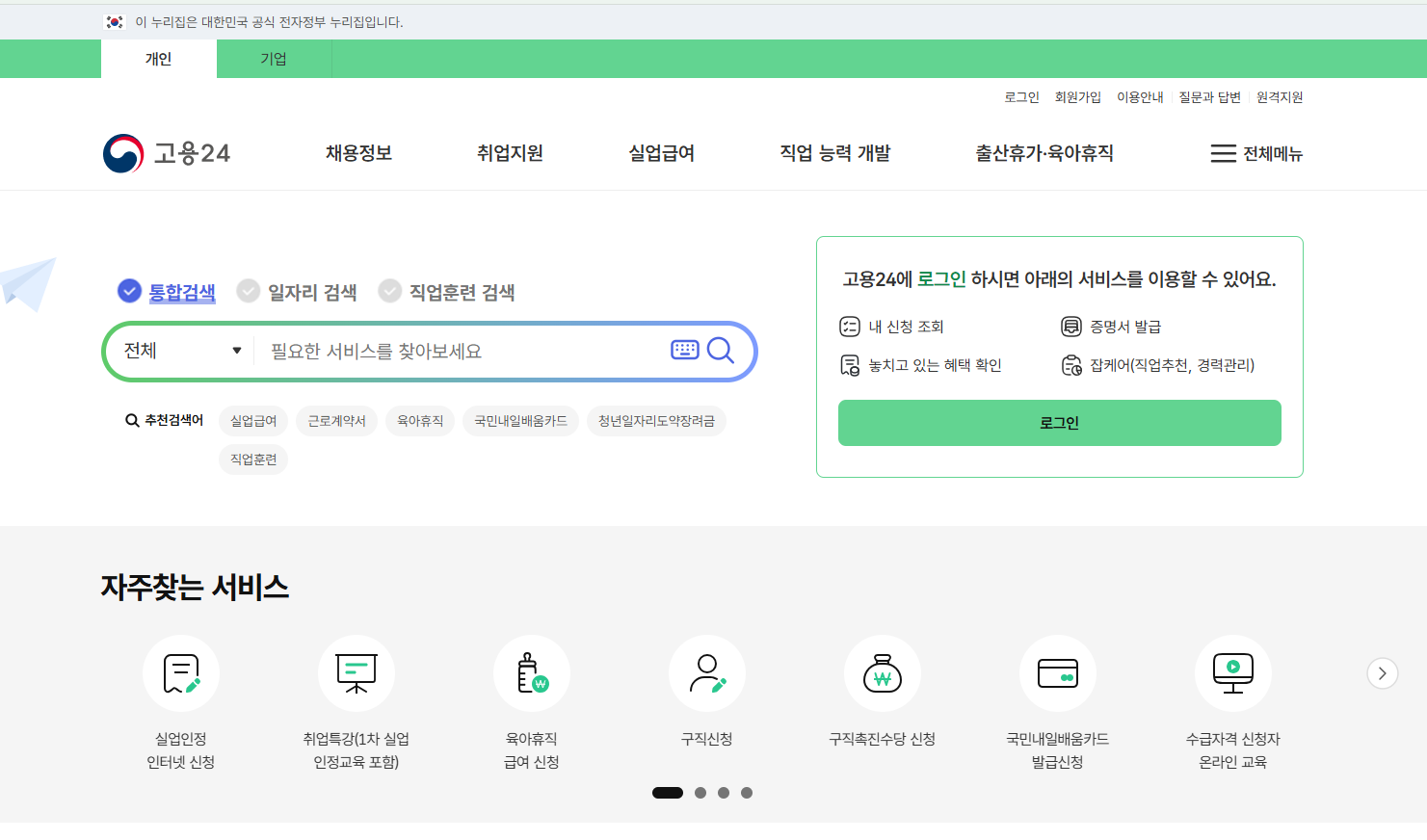 사업주가 육아휴직 확인서를 제출했음을 확인했다면, 이제 근로자가 직접 육아휴직급여 신청을 할 차례입니다. 고용24 홈페이지에 접속하여 공인인증서 또는 공동인증서로 로그인합니다. 본인 인증 절차는 필수이므로, 미리 공인인증서를 준비해두는 것이 좋습니다. 고용24 홈페이지 메인 화면에서 개인 서비스 메뉴를 찾아 들어갑니다.